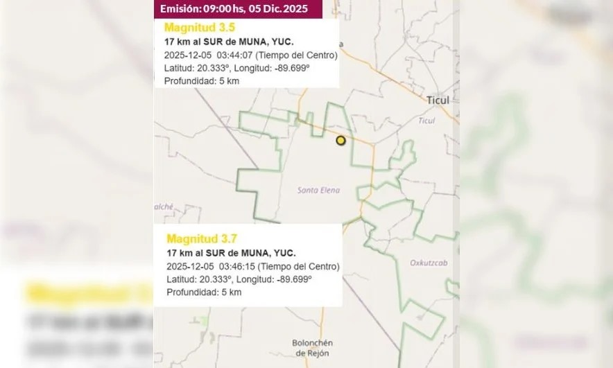 El estado de Yucatán registró durante la madrugada de este viernes dos sismos de baja magnitud, un fenómeno poco común en la región, según informó el Servicio Sismológico Nacional (SSN). Ambos eventos tuvieron como epicentro una zona al sur del municipio de Muna.
