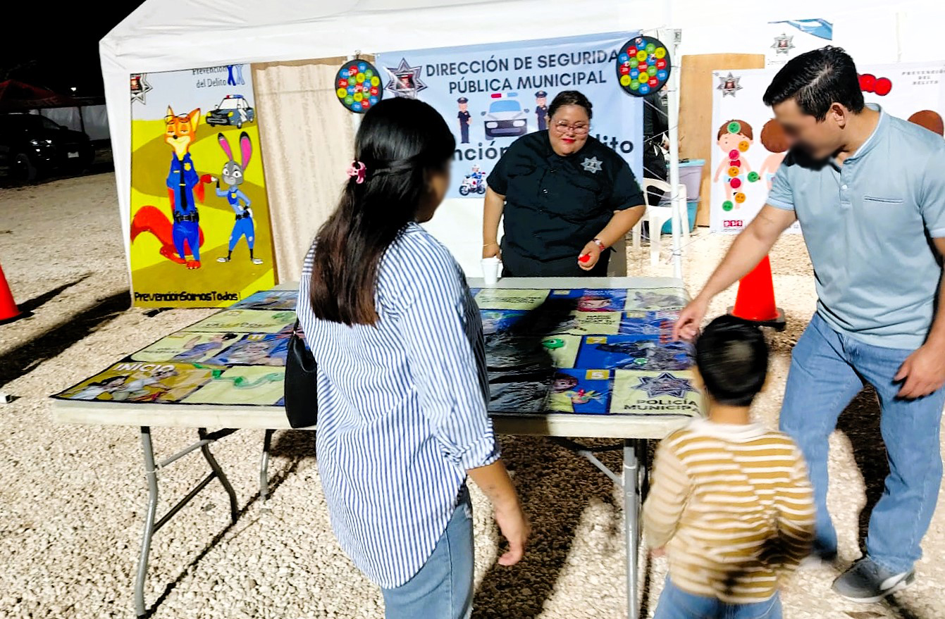 Desde temprano, el stand de Prevención del Delito de la Policía Municipal se convierte en un punto de encuentro especial. Ahí, los uniformes dejan de ser sinónimo de autoridad distante y se mezclan con risas, colores y dinámicas pensadas para sembrar conciencia desde la infancia. Oficiales y pequeños comparten el mismo terreno: el del juego que educa.