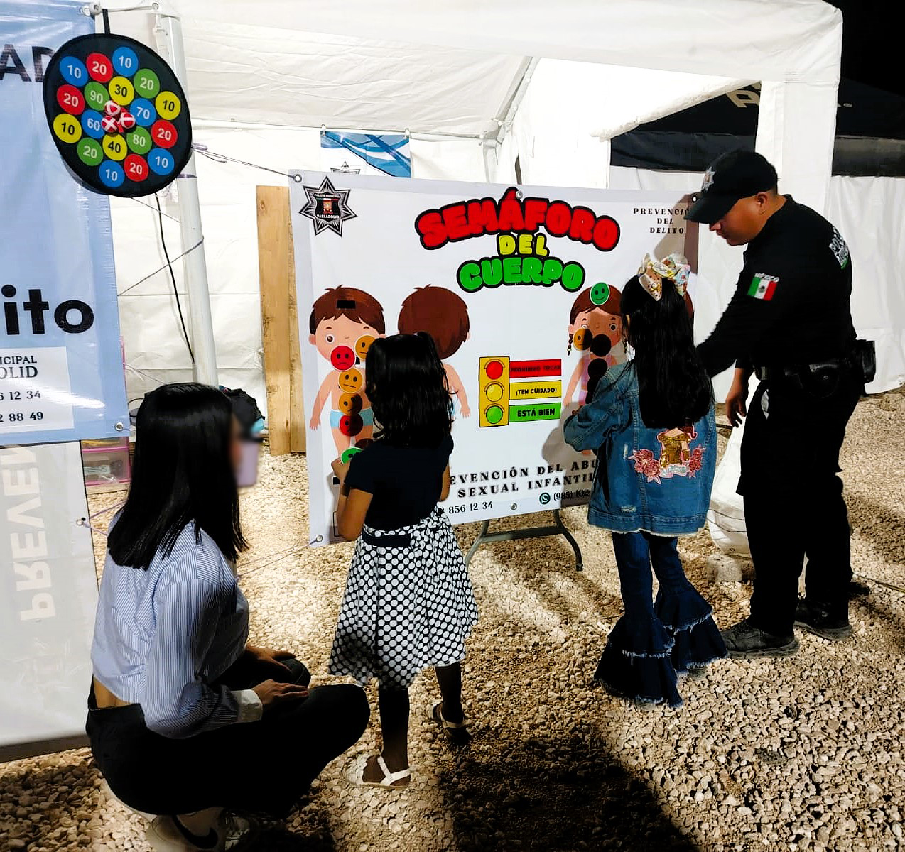 Desde temprano, el stand de Prevención del Delito de la Policía Municipal se convierte en un punto de encuentro especial. Ahí, los uniformes dejan de ser sinónimo de autoridad distante y se mezclan con risas, colores y dinámicas pensadas para sembrar conciencia desde la infancia. Oficiales y pequeños comparten el mismo terreno: el del juego que educa.